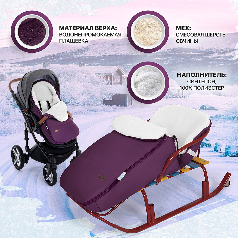 Основа конверта — смесовая овечья шерсть, представляющая собой сочетание натуральной овчины и текстильного материала, который значительно уменьшает вес изделия (конверт весит 0,7 кг). Мягкий пушистый ворс приятен на ощупь, а природные свойства шерсти создают внутри конверта оптимальную терморегуляцию и способствуют здоровому сну.