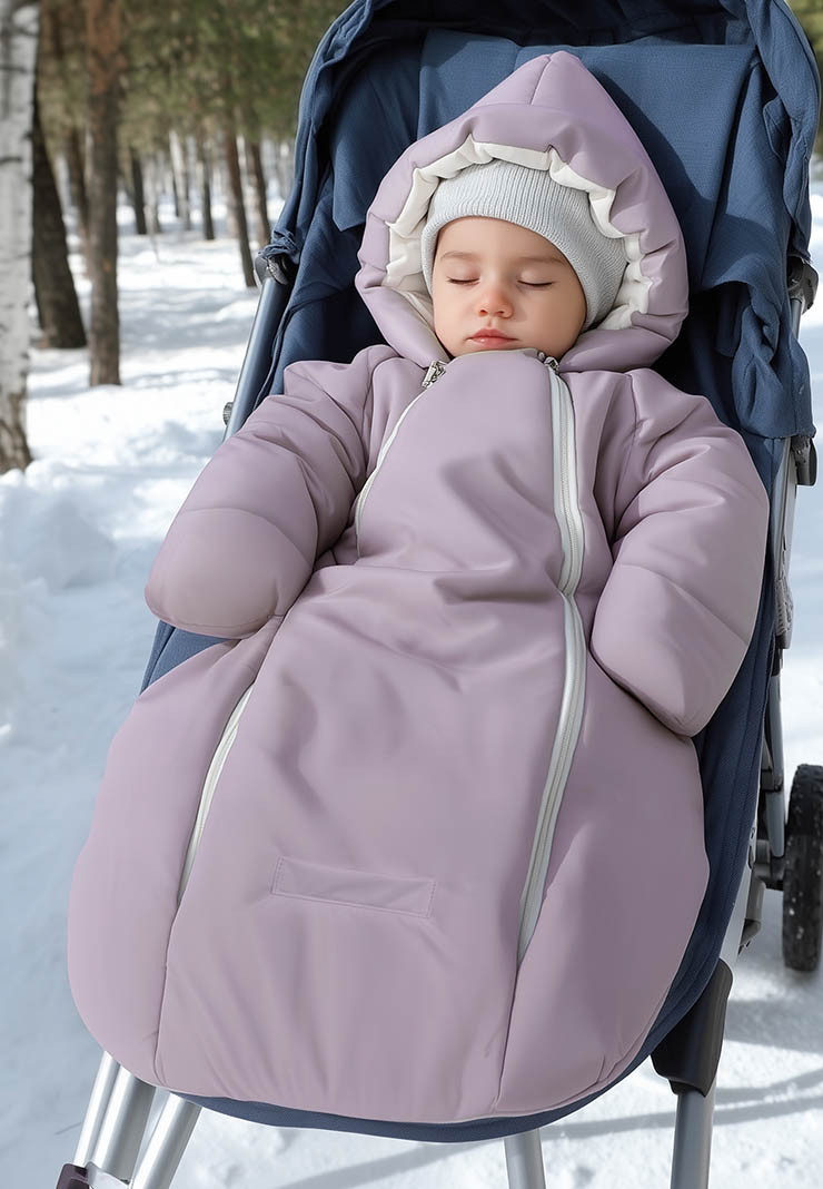- Капюшон на резинке и конструкция ворота защитят малыша от ветра;