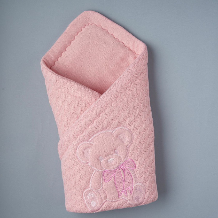 Конверт-одеяло на выписку вязаный весна-осень Little Star мишутка розовый бант, розовый