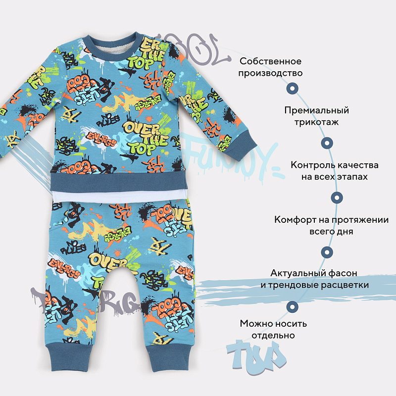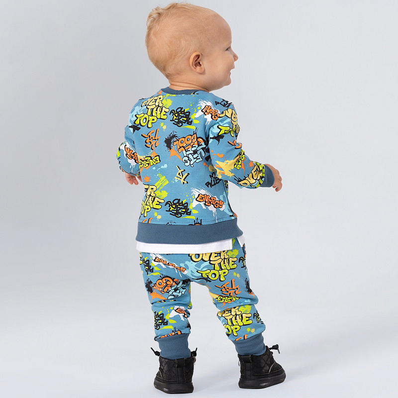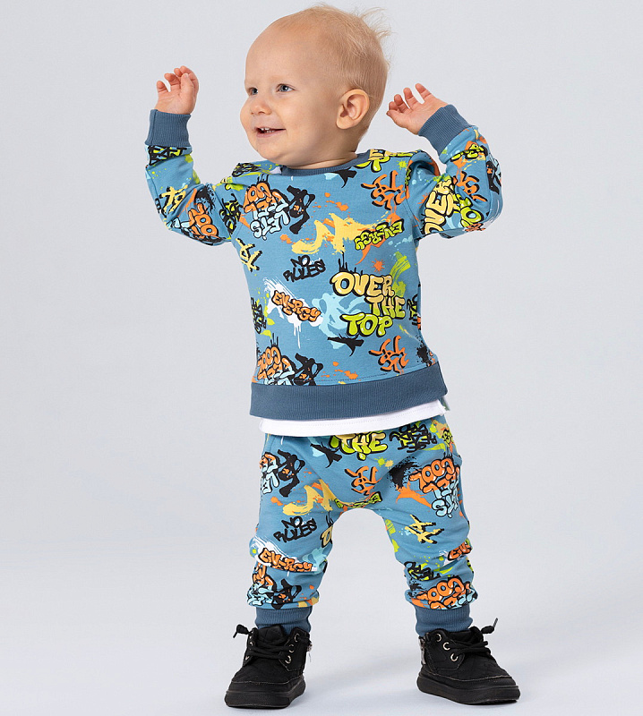 Стильный костюм RANT BASIC COOL подарит малышу невероятный комфорт. Модель покорит вас: дизайнерским принтом, лаконичным исполнением, премиальными тканями, растущей манжетой на штанишках.