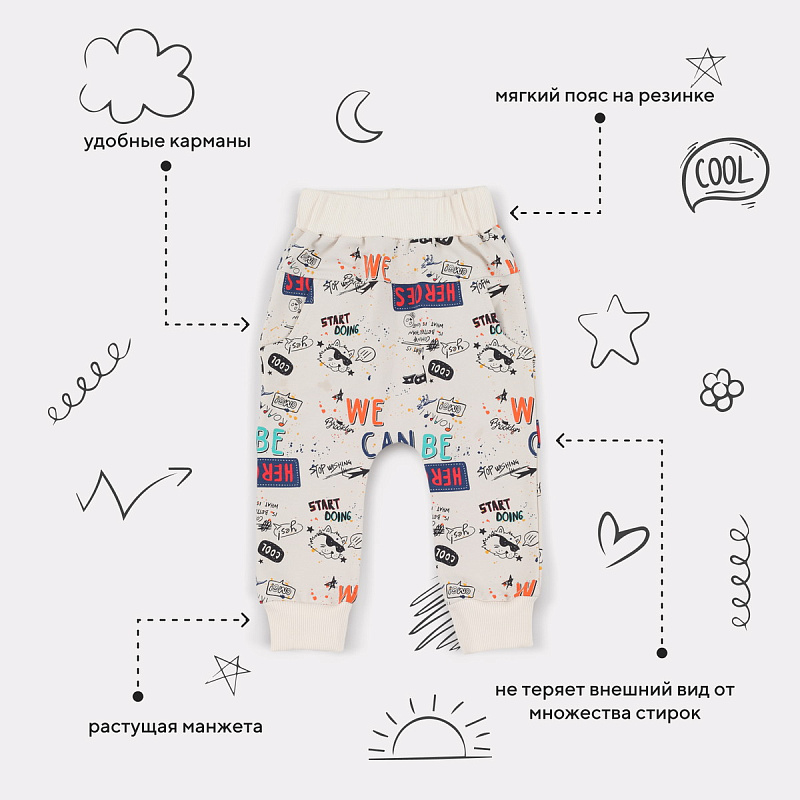 Стильный костюм RANT BASIC COOL подарит малышу невероятный комфорт. Модель покорит вас: дизайнерским принтом, лаконичным исполнением, премиальными тканями, растущей манжетой на штанишках.