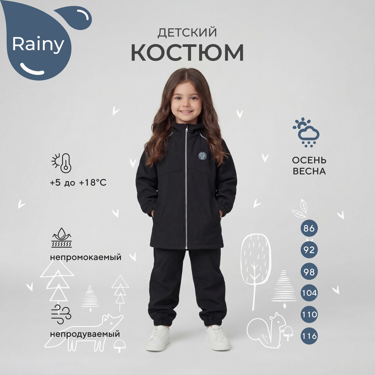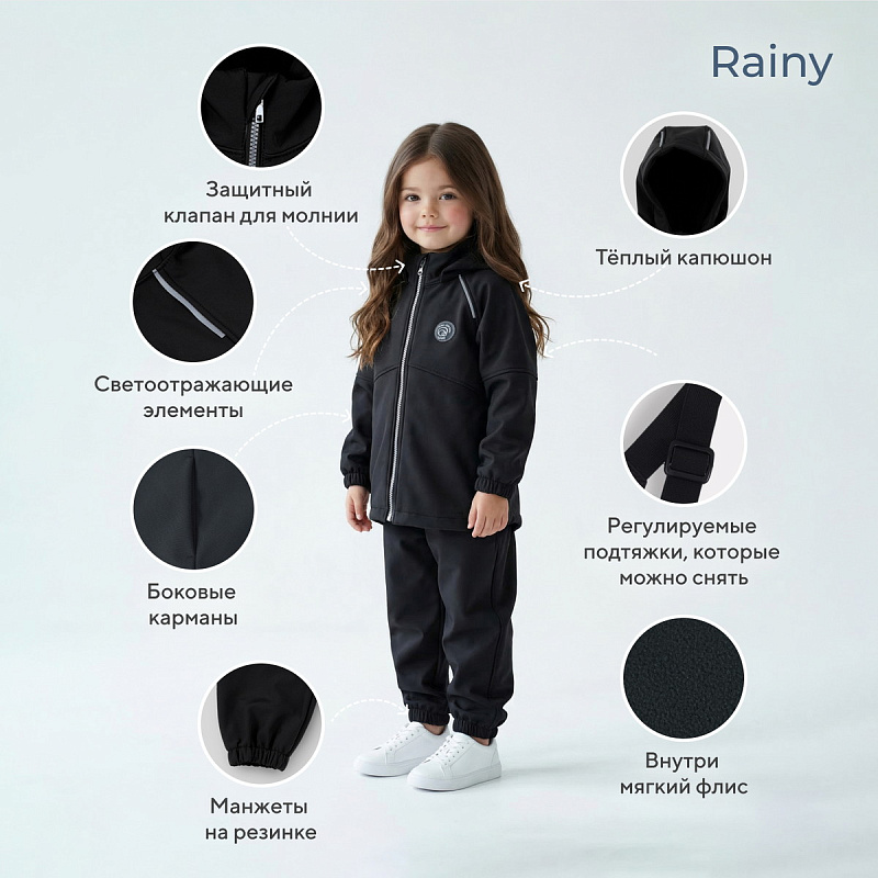Какое детство без прогулок по лужам? Детский демисезонный костюм RANT RAINY подарит малышу невероятное ощущение уюта и тепла. Модель покорит вас: инновационным влагоотталкивающим и ветронепроницаемым материалом софтшелл, тщательно продуманными деталями кроя, лаконичным исполнением, комфортным лекалом.