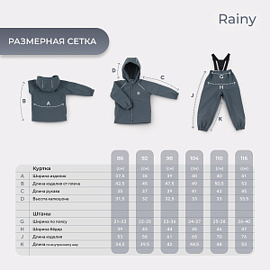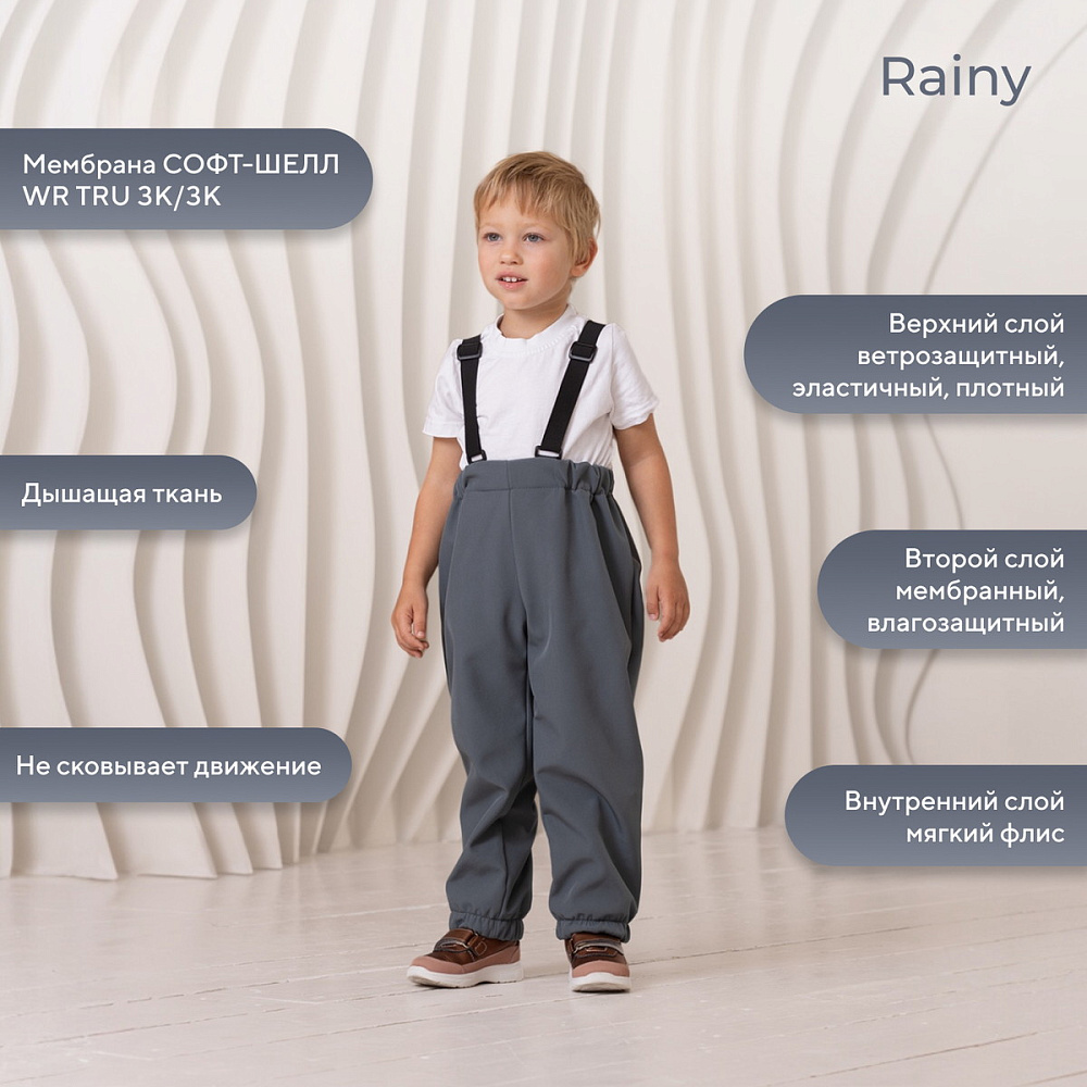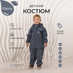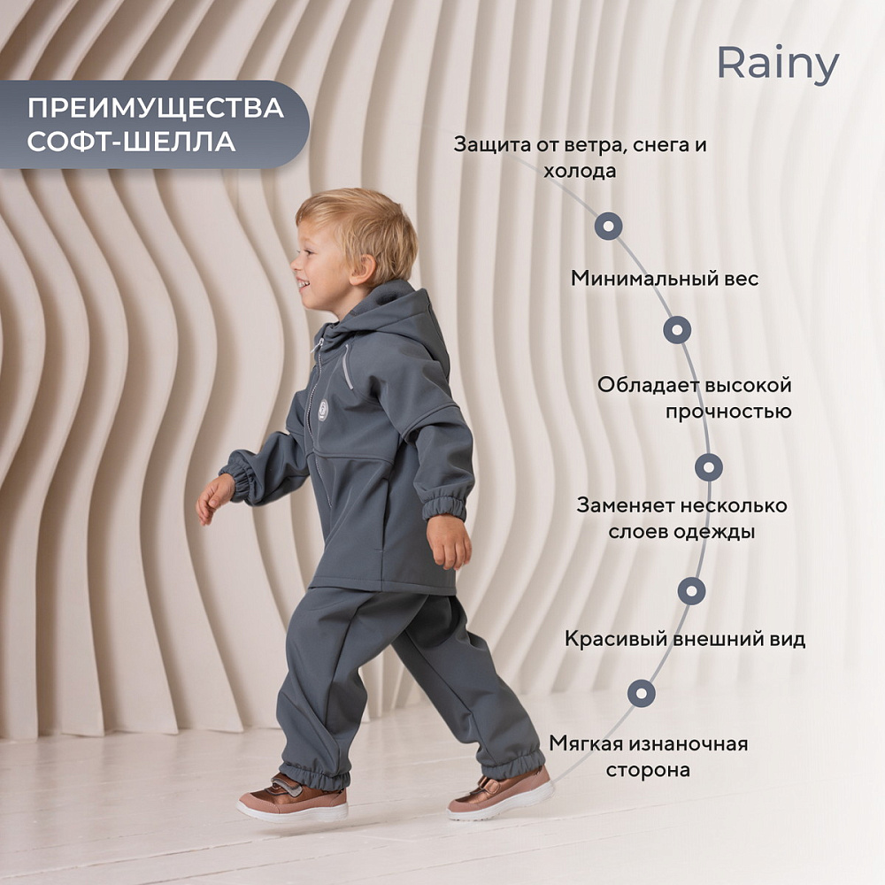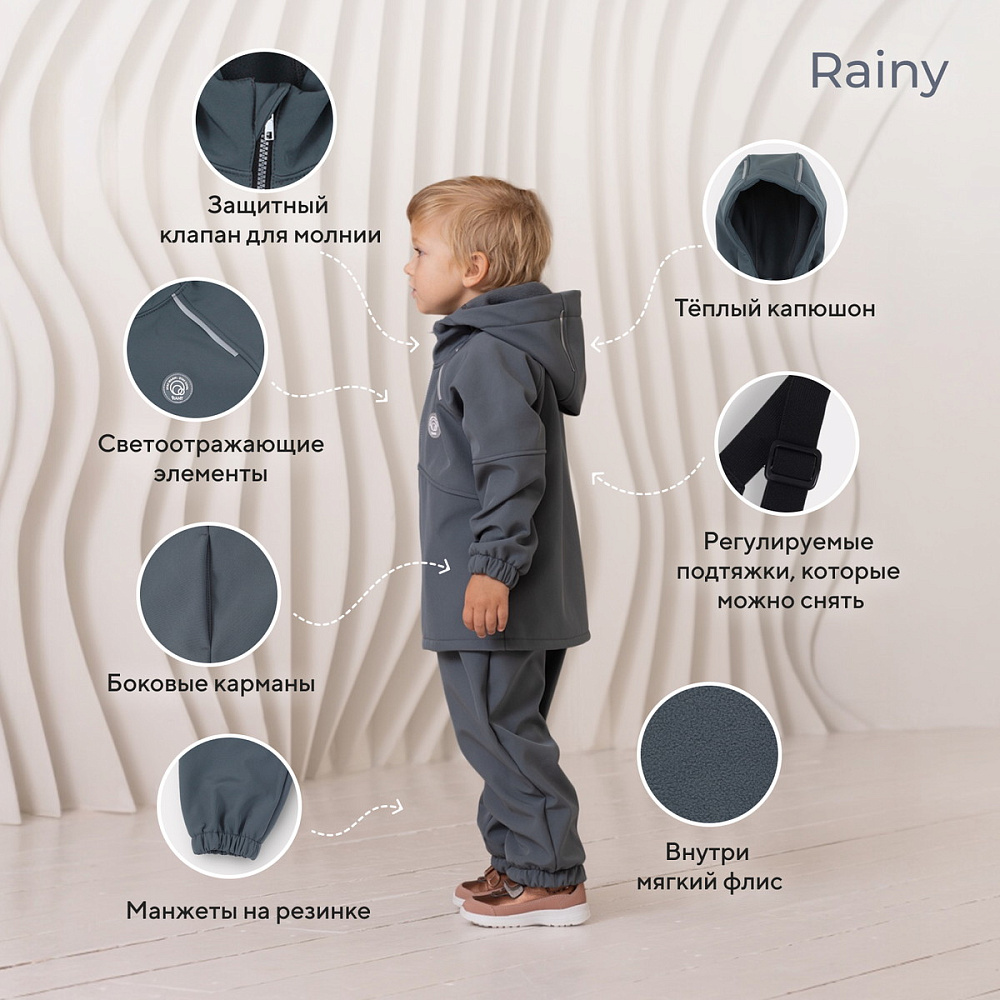 Какое детство без прогулок по лужам? Детский демисезонный костюм RANT RAINY подарит малышу невероятное ощущение уюта и тепла. Модель покорит вас: инновационным влагоотталкивающим и ветронепроницаемым материалом софтшелл, тщательно продуманными деталями кроя, лаконичным исполнением, комфортным лекалом.