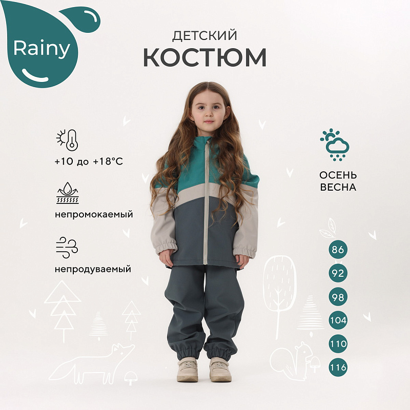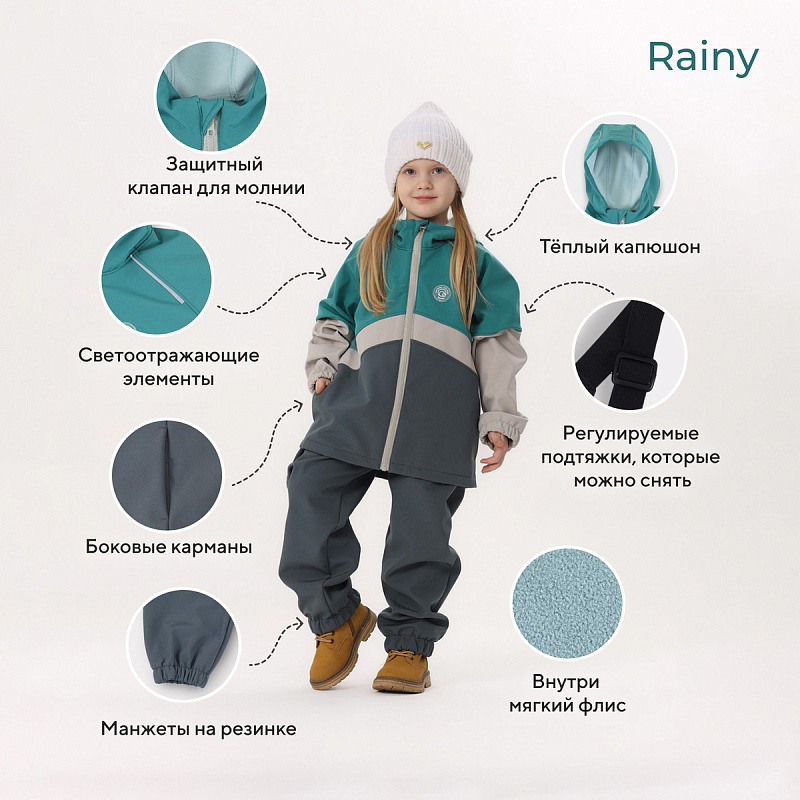 Какое детство без прогулок по лужам? Детский демисезонный костюм RANT RAINY подарит малышу невероятное ощущение уюта и тепла. Модель покорит вас: инновационным влагоотталкивающим и ветронепроницаемым материалом софтшелл, тщательно продуманными деталями кроя, лаконичным исполнением, комфортным лекалом.