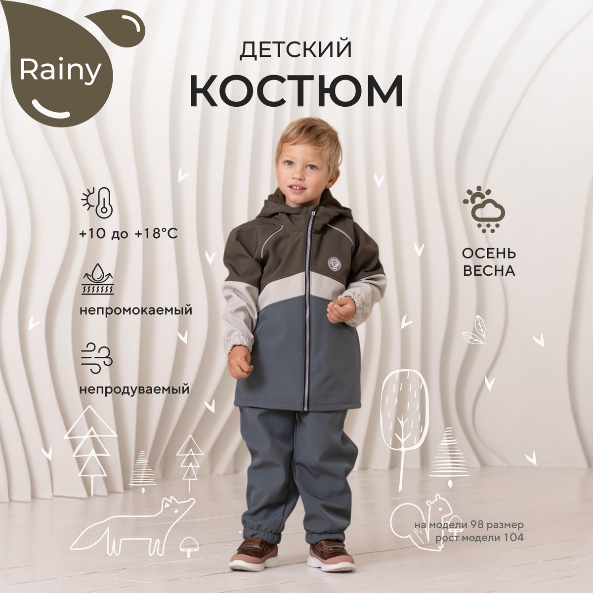 Какое детство без прогулок по лужам? Детский демисезонный костюм RANT RAINY подарит малышу невероятное ощущение уюта и тепла. Модель покорит вас: инновационным влагоотталкивающим и ветронепроницаемым материалом софтшелл, тщательно продуманными деталями кроя, лаконичным исполнением, комфортным лекалом.