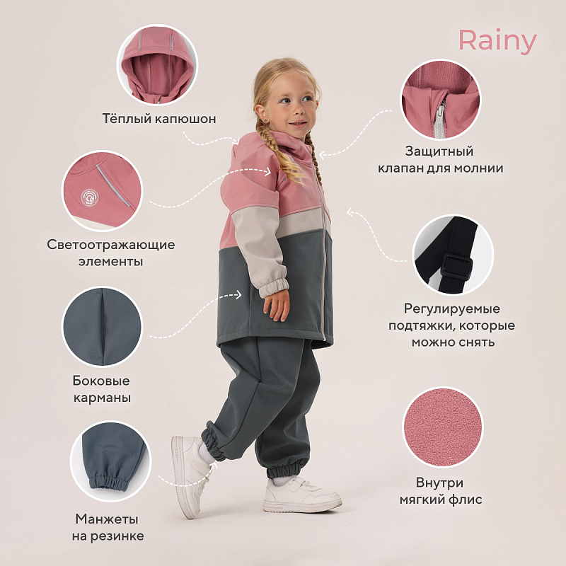 Какое детство без прогулок по лужам? Детский демисезонный костюм RANT RAINY подарит малышу невероятное ощущение уюта и тепла. Модель покорит вас: инновационным влагоотталкивающим и ветронепроницаемым материалом софтшелл, тщательно продуманными деталями кроя, лаконичным исполнением, комфортным лекалом.