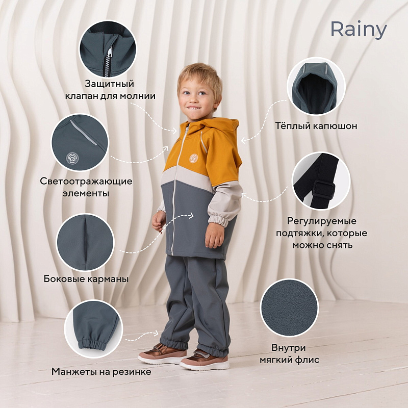 Какое детство без прогулок по лужам? Детский демисезонный костюм RANT RAINY подарит малышу невероятное ощущение уюта и тепла. Модель покорит вас: инновационным влагоотталкивающим и ветронепроницаемым материалом софтшелл, тщательно продуманными деталями кроя, лаконичным исполнением, комфортным лекалом.