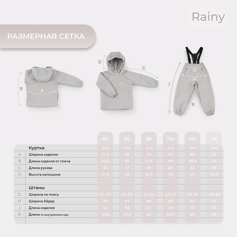 Какое детство без прогулок по лужам? Детский демисезонный костюм RANT RAINY подарит малышу невероятное ощущение уюта и тепла. Модель покорит вас: инновационным влагоотталкивающим и ветронепроницаемым материалом софтшелл, тщательно продуманными деталями кроя, лаконичным исполнением, комфортным лекалом.