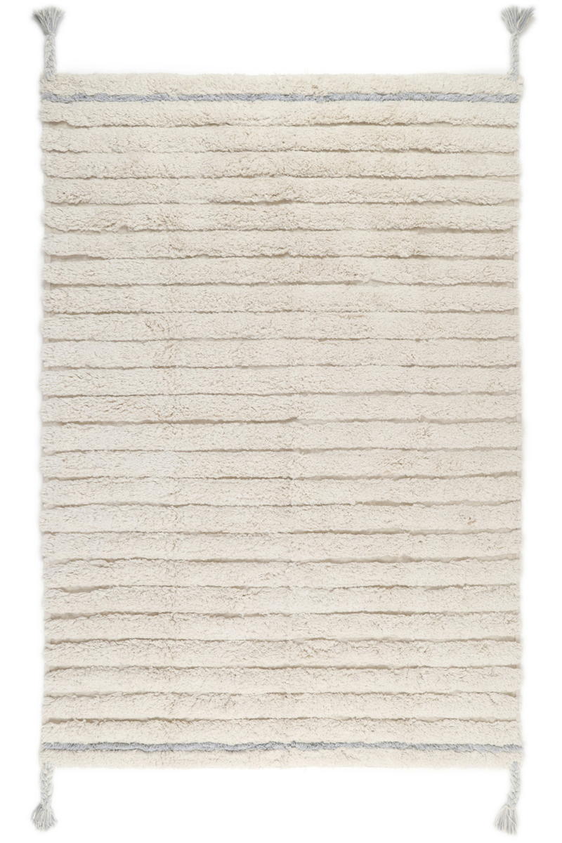 Dalia — бархатный ковер в виде крупных полос в бежевом цвете и подчеркнутый линией небесно-голубого цвета по краям ковра. Красивые косы, сочетающие два цвета, украшают края ковра, придавая пространству стильную атмосферу и изюминку. Dalia облегчит вашу повседневную жизнь благодаря натуральному текстилю, который можно стирать в машине. Попрощайтесь с пятнами! Этот ковер изготовлен из чистого хлопка и имеет маркировку OEKO-TEX, что говорит о безусловной гарантии безопасности для конечного потребителя. Маркировка демонстрирует, что все материалы — от самой ткани до красителей, использованные в производстве, безвредны и нетоксичны.