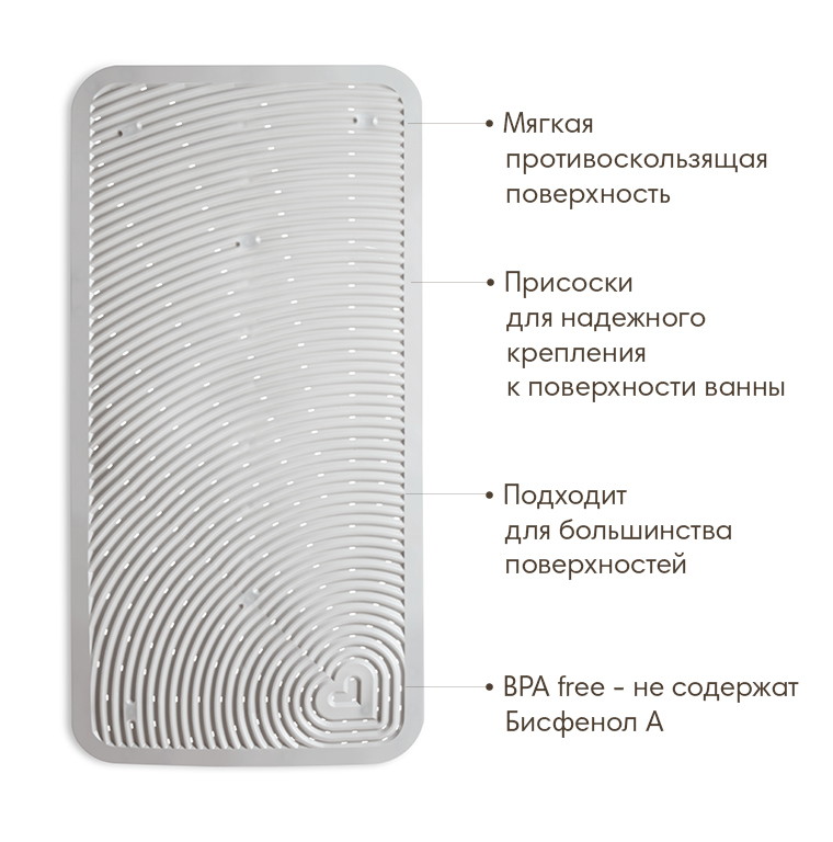 Этот коврик для ванной станет незаменимым для безопасности ребенка во время купания - он предотвратит скольжение и станет "мягкой опорой" для малыша. Специальные углубления по периметру коврика создают надежное сцепление с ванной и дают дополнительный комфорт, а прочные присоски обеспечивают фиксацию на поверхности ванны или душа. Коврик подходит для большинства поверхностей. А отверстия в коврике для ванной от Munchkin избавляют от риска появления плесени и грибка. Коврик подходит для купания не только детей, но и взрослых!