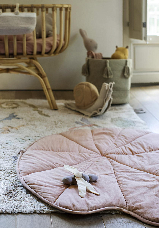 Коврик Lorena Canals игровой Водная лилия винтажный 95х95 см – это не обычный ковер с ворсинками, которые малыш может засунуть в рот. Это настоящий мат - ровный, с гладкой поверхностью без ворса снаружи и с мягким наполнителем внутри. Его размер, толщина и форма идеальны для первых месяцев жизни малыша, которые он проводит неподвижно или в попытках освоить самые простые перемещения. А чтобы крохе не было скучно долго лежать, вместе с матом вы получаете мягкую текстильную погремушку, продолжающую все те же природные мотивы.