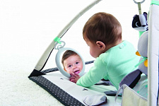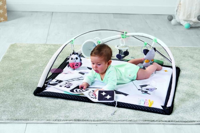 Раздвиньте дуги и максимально откройте пространство. Положите малыша на животик и увлеките его книжкой или безопасным зеркальцем. Это поможет ему оставаться на животике долгое время и укрепить мышцы шеи и спины.