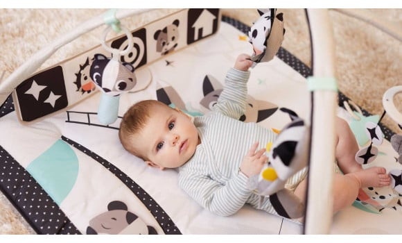 контрастные чёрно-белые картинки, различные текстуры и музыкальная игрушка воздействуют на органы чувств с самого первого дня. Позвольте малышу дотянуться до игрушек, потрогать и внимательно рассмотреть их.