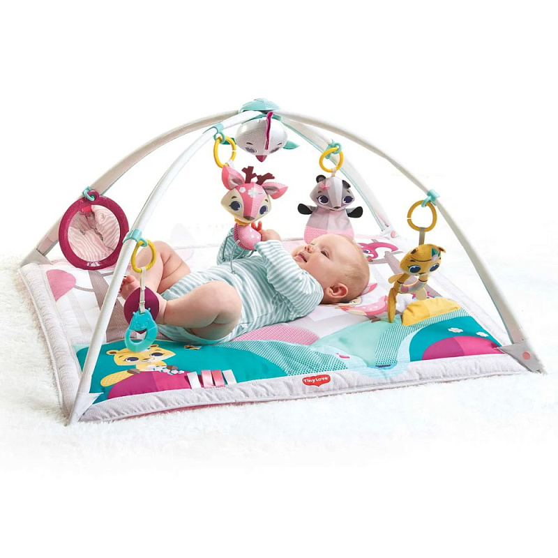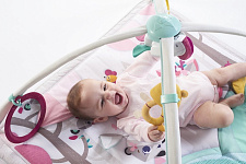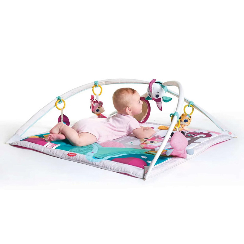 Развивающий коврик в нежных розовых тонах для маленьких принцесс. В комплекте 4 подвесные игрушки и безопасное зеркальце, которые можно использовать отдельно. Нежные не броские оттенки, возможность регулировать наклон дуг и переставлять игрушки делают этот коврик универсальной площадкой для игр. Игрушка в виде птички производит музыку и может светиться. На самом коврике также встроенные развивающие элементы в виде разных фактур, ленточек, шуршащих элементов и открывашек.