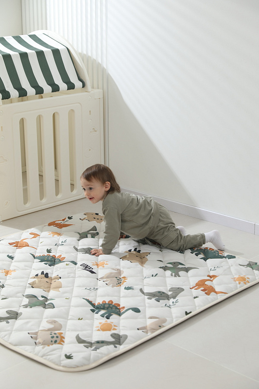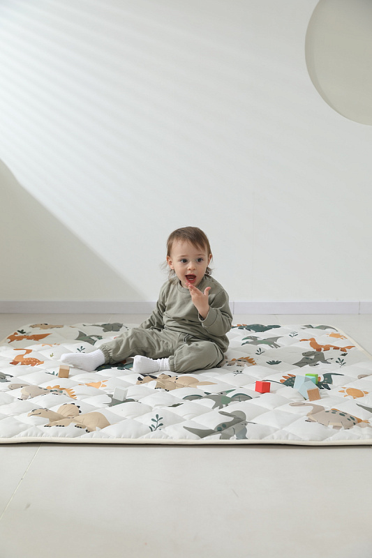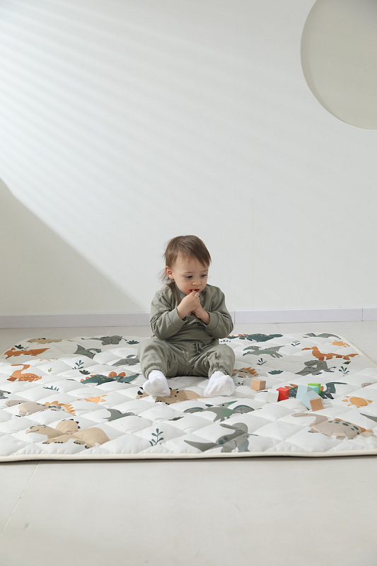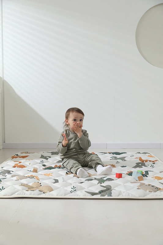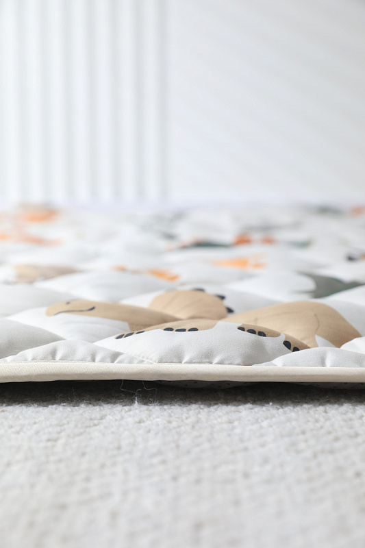 Поверхность выполнена из премиальной ткани хлопок / Cotton Silk, сочетающей прочность и долговечность с приятным тактильным ощущением. Наполнителем служит 100% хлопковое волокно, обеспечивающее оптимальную толщину коврика для детей, способствующую созданию амортизации при движении крохи от 0 месяцев.