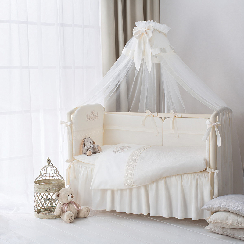 В набореПростыня на резинке (без рюши) 105х170 см, наволочка 40х60 см, пододеяльник на молнии 102х143 см.