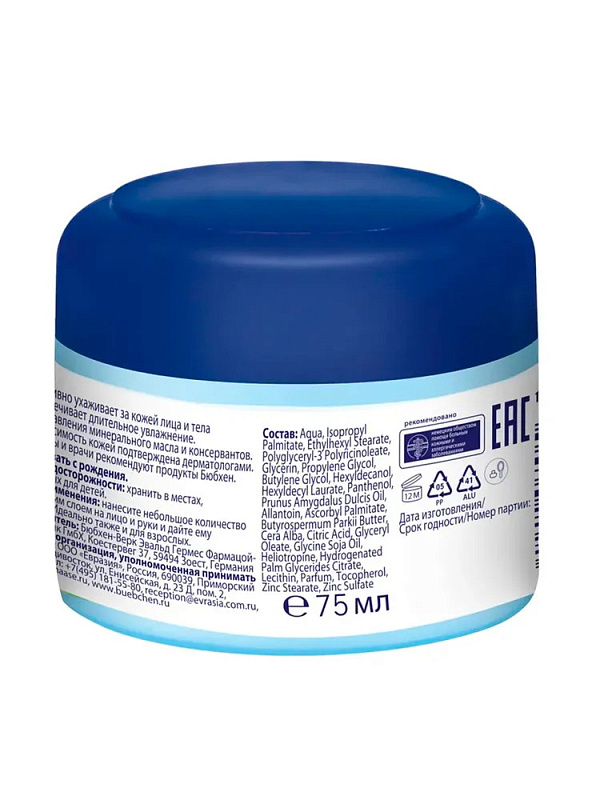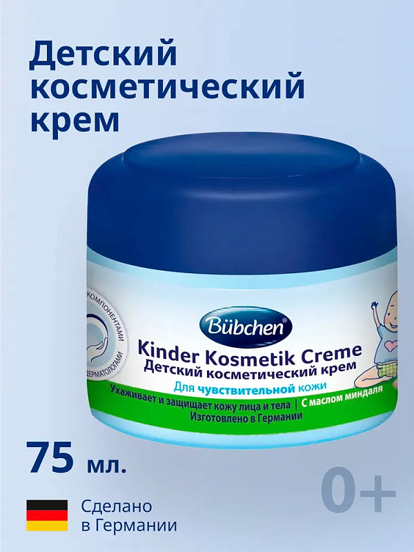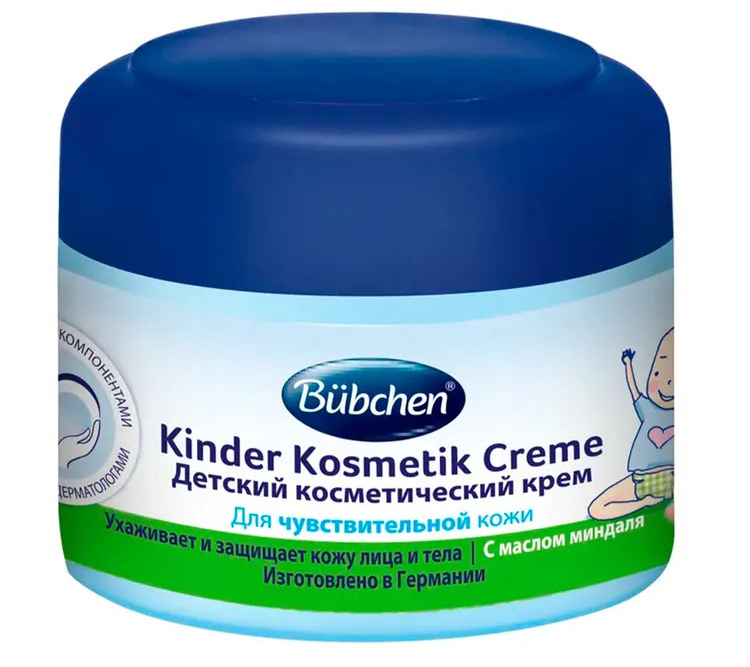 Bubchen – детский крем - эксперт по уходу за нежной и чувствительной кожей ребёнка. Bubchen один из ведущих немецких производителей детской косметики и косметики новорожденных. Более 60 лет Bubchen производит продукты для ухода и защиты нежной кожи младенцев.Подходит для детей с первых дней жизни. Детский крем для младенцев станут первыми помощниками при уходе за лицом и телом малыша. Для любого типа кожи и любого возраста.Крем для новорожденных для лица и тела немецкого бренда Бюбхен создан для мгновенного восстановления, увлажнения и успокоения сухой, раздраженной и чувствительной кожи. Он интенсивно увлажняет, смягчает, восстанавливает, питает и помогает восстановить защитный барьер кожи.Детский крем подходит для чувствительной, сухой кожи, бальзамБогатая полезными веществами формула с маслом карите и миндаля, а также пантенолом и пчелиным воском снабжает кожу влагой на длительное время. Пантенол, входящий в состав бальзама, оказывает успокаивающее и противовоспалительное действие, а масло карите (ши) обеспечивает интенсивный питательный эффект и уменьшает сухость и стянутость кожи. Благодаря маслам кожа становится гладкой и бархатистой.Формула разработана с целью снижения риска аллергических реакций, рН нейтрально для кожи. В составе не содержит вредных для детской кожи: парабенов, минеральных масел, консервантов и красителей. Подходит для новорожденных, детей и взрослых. Бальзам подходит для ежедневного применения и может использоваться детьми и взрослыми.Гипоаллергенно. Безопасность средства подтверждают результаты независимых клинических исследований. Акушеры и врачи рекомендуют Бюбхен.Нанести небольшое количество крема тонким слоем на лицо и ручки малыша. Легкими массирующими движениями распределить крем по коже. На особенно чувствительные или сухие участки кожи нанести большее количество продукта. Дать впитаться.Производство Бюбхен-Верк Эвальд Гермес Фармацойтише Фабрик ГмбХ, Германия.