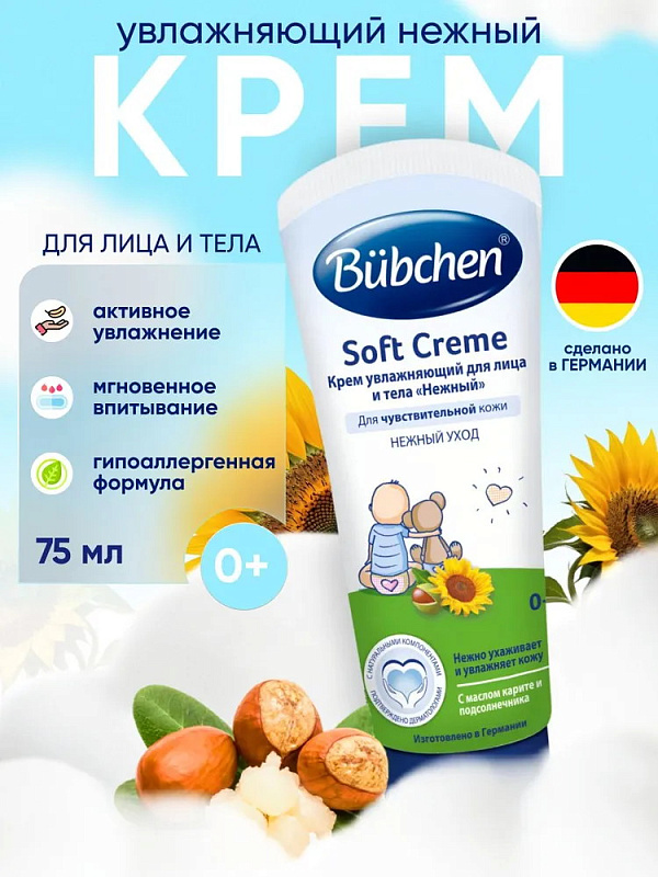 Увлажняющий крем Bubchen "Нежный" имеет легкую консистенцию крема "масло в воде", которая позволяет ему мгновенно впитываться кожей и оставлять приятное ощущение. Чистые растительные масла и увлажняющие ингредиенты крема для лица и тела ухаживают за нежной кожей и защищают ее от пересыхания. Масло подсолнечника поддерживает естественный защитный барьер кожи, а масло карите делает ее нежной и эластичной. Пантенол, гелиотропин и витамин Е - увлажняют и препятствуют возникновению раздражения. Без добавления минерального масла, консервантов и красителей. Крем Бюбхен предназначен для увлажнения нормальной и сухой кожи. Для детей с рождения и для всей семьи. Способ применения: Легкими массирующими движениями нанести небольшое количество крема тонким слоем на сухие участки кожи. Дать крему впитаться. Подходит для ежедневного применения.