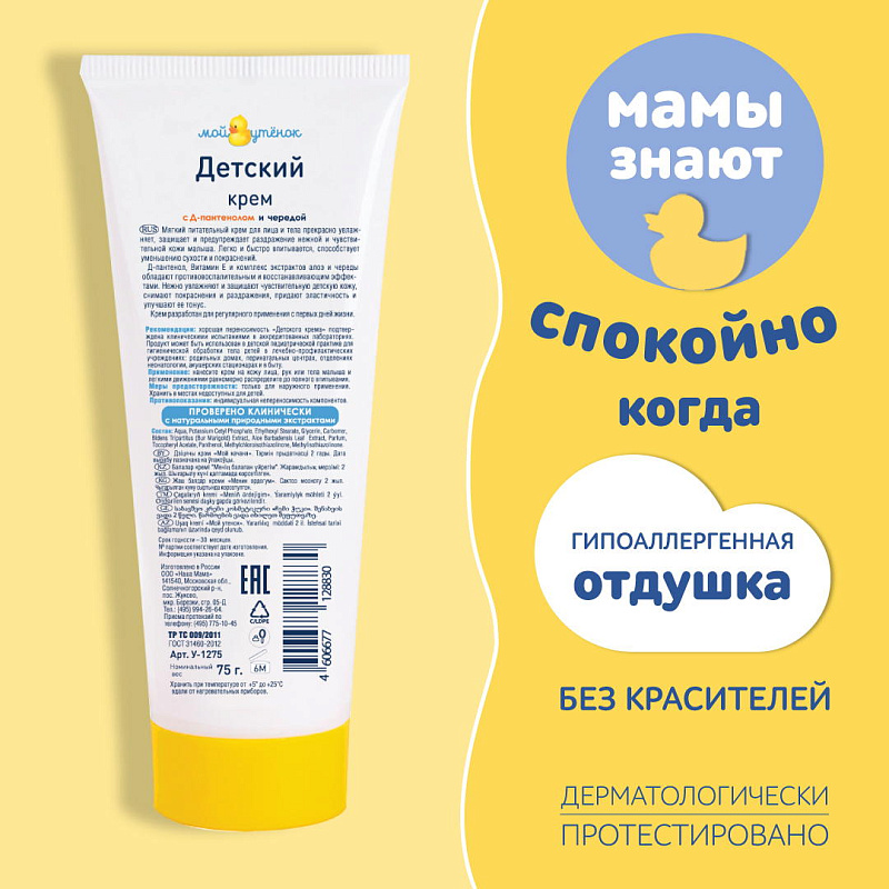 Мягкий питательный детский крем 2 в 1 "Мой утенок" прекрасно увлажняет, защищает и предупреждает раздражение нежной и чувствительной кожи малыша. Крем не содержит минеральных масел, силиконов, красителей и парабенов. Комплекс из экстрактов череды и алоэ, Д-пантенола и витамина E, входящие в состав, придает эластичность и улучшает тонус кожи, способствует снятию покраснения и раздражений. Череда обладает противовоспалительным и ранозаживляющим действием. Д-пантенол и витамин B5, способствуют восстановлению поврежденных тканей, устранению воспалений и сухости кожи. Крем легко и быстро впитывается, обеспечивая естественный воздухообмен кожи малыша. Крем разработан для регулярного ежедневного применения с первых дней жизни.