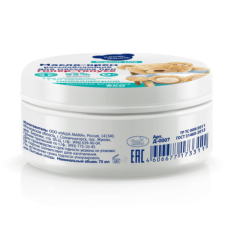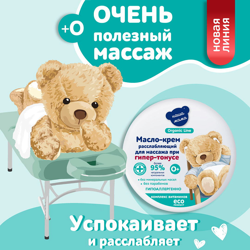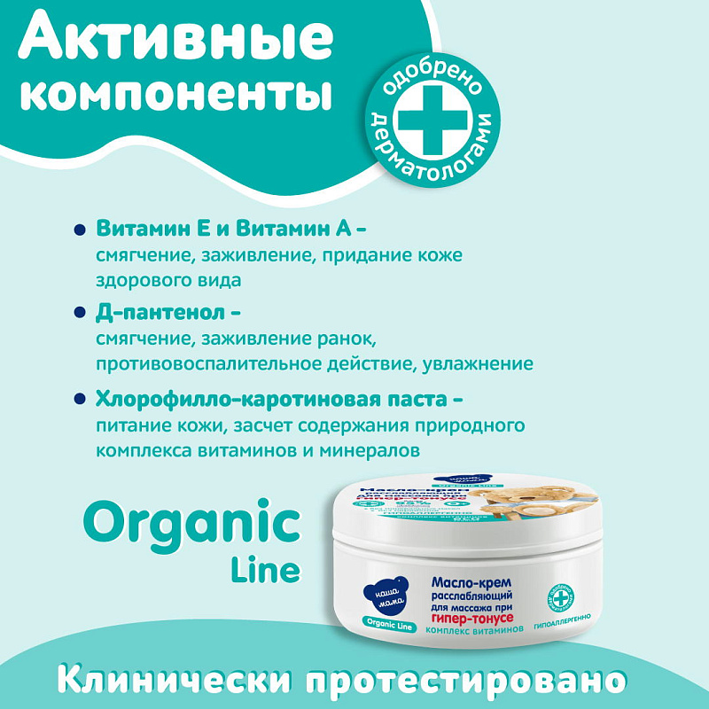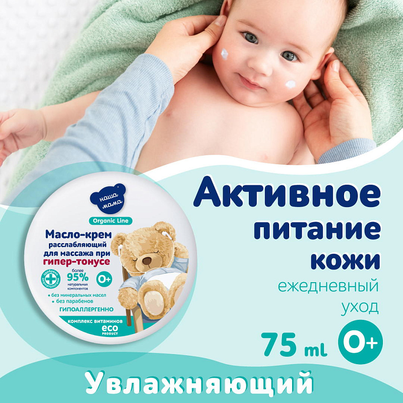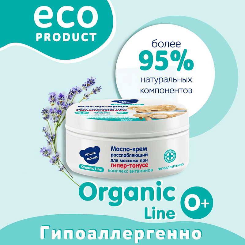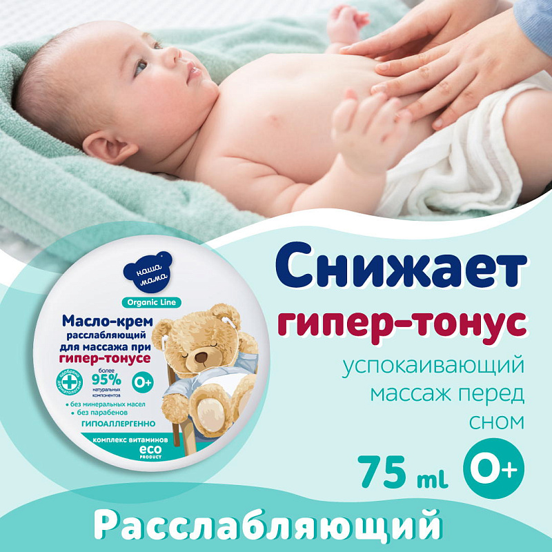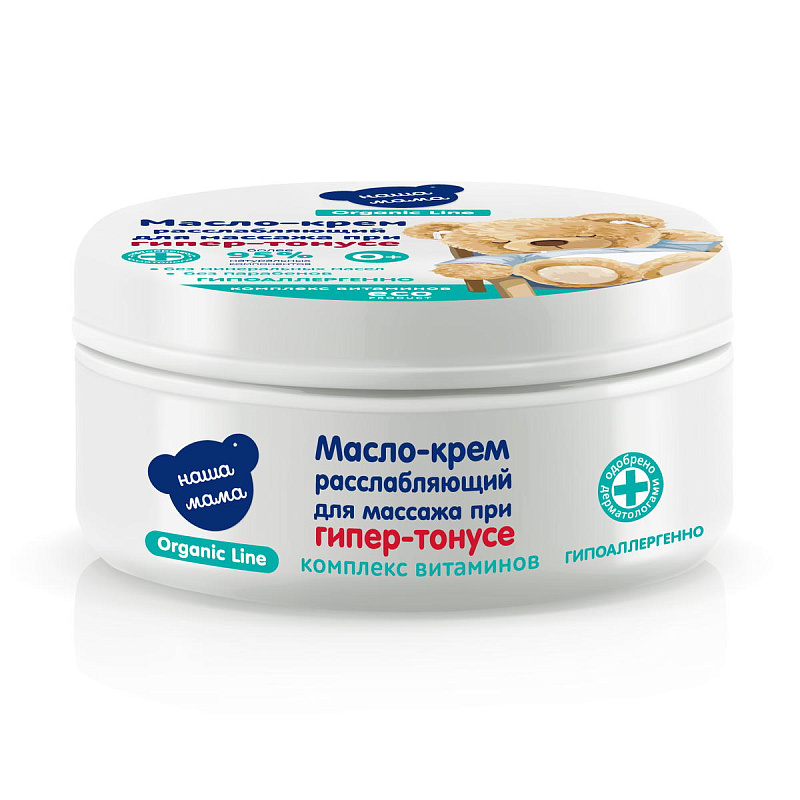 Детское масло-крем для массажа расслабляющее при гипер-тонусе серии "Наша мама Organic line" создано на основе специальной органической эко-формулы состоящей из натуральных масел, Д-пантенола и витаминов. Масло-крем идеально подойдет для мягкого успокаивающего и расслабляющего массажа малышу. Масло-крем для массажа рекомендовано для ежедневного применения с первых дней жизни малыша.