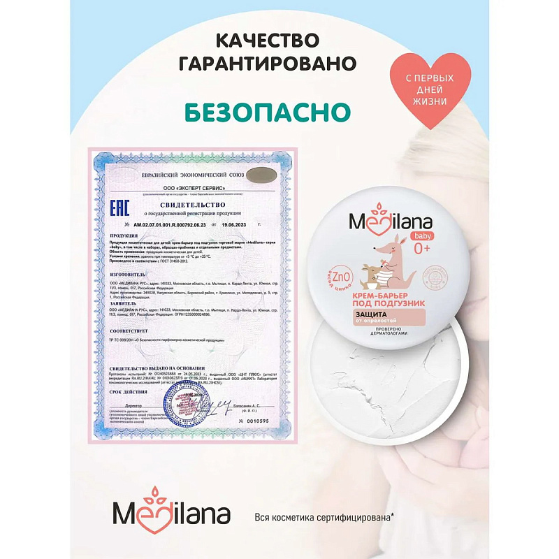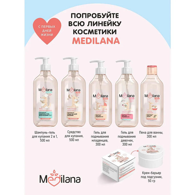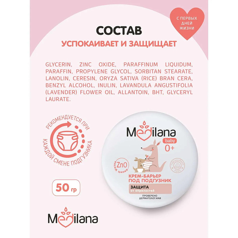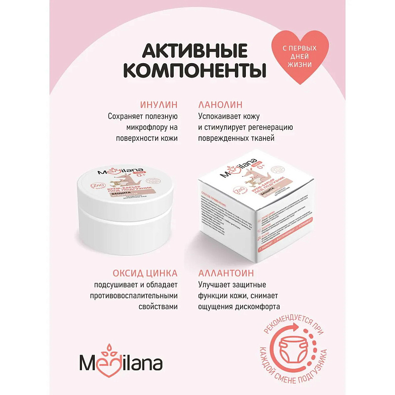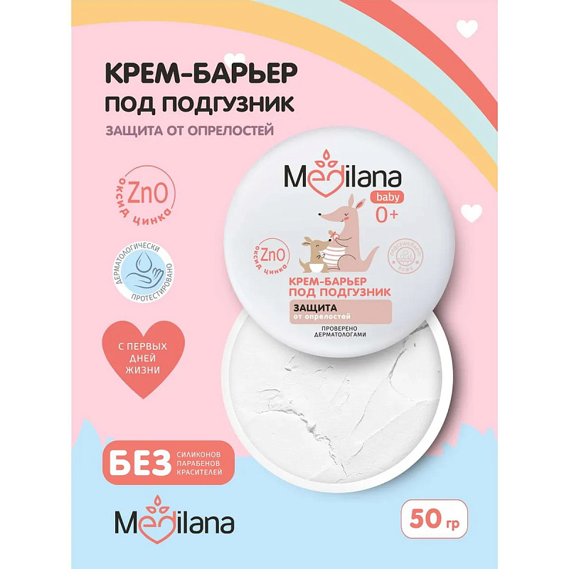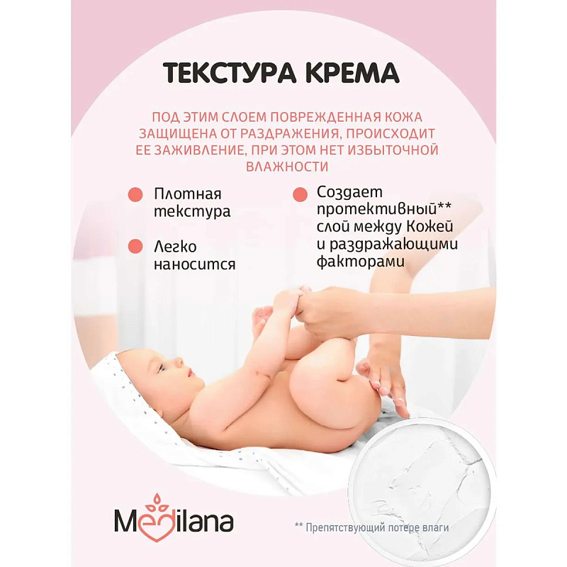 Крем-барьер под подгузник Medilana baby - защищает кожу от появления опрелостей; - уменьшает риск образования раздражений и покраснений; - способствует восстановлению поврежденных участков кожи; - успокаивает кожу и снижает ощущения дискомфорта; - подсушивает;