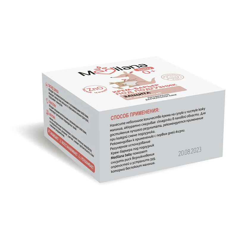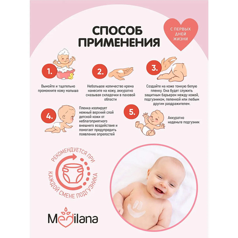 Способ применения: нанесите небольшое количество крема на сухую и чистую кожу малыша, аккуратно смазывая складочки в паховой области. Для достижения лучшего результата, рекомендуется применение при каждой смене подгузника. Рекомендован к применению с первых дней жизни. Регулярное использование Крем-барьера под подгузник Medilana baby помогает снизить риск возникновения опрелостей и устранить зуд, который беспокоит малыша.