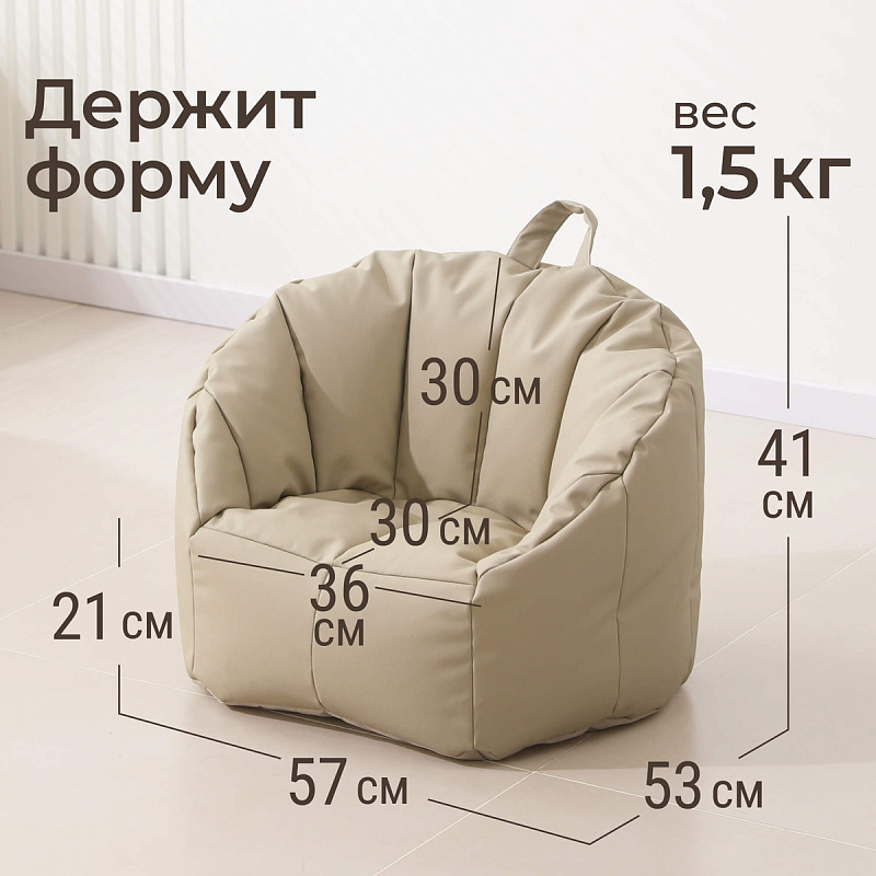 Конструкция мягкого кресла для малышей снабжена усиленными швами, обеспечивающими надежность и устойчивость к механическим повреждениям. Бескаркасная структура придает изделию гибкость и эргономичность, позволяя малышу свободно менять позу, занимаясь творчеством, играя или читая книгу.