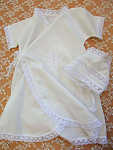 Роскошный крестильный комплект выполнен из 100% нежнейшего хлопка. Оформлен красивым белым кружевом и крестиком из страз на кружеве. Модель с запахом для удобного одевания на малыша.
