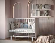 Кроватка выполнена из массива березы, без острых углов, с ортопедическим реечным основанием из неокрашенного дерева. Спальное ложе регулируется по высоте в трех положениях, по мере роста ребенка (чем старше ребенок, тем ниже спальное ложе). Передник бортик (автостенка) очень легко регулируется по высоте и быстро снимается, например, чтобы заправить кроватку, использовать кровать как приставную на ночь рядом со взрослой. Бортики кроватки оснащены специальными накладками - антигрызунками, которые защитят детские зубки от соприкосновения с мебелью во время прорезывания зубов.