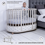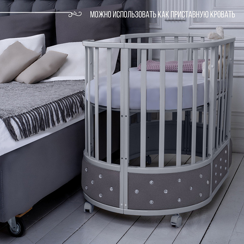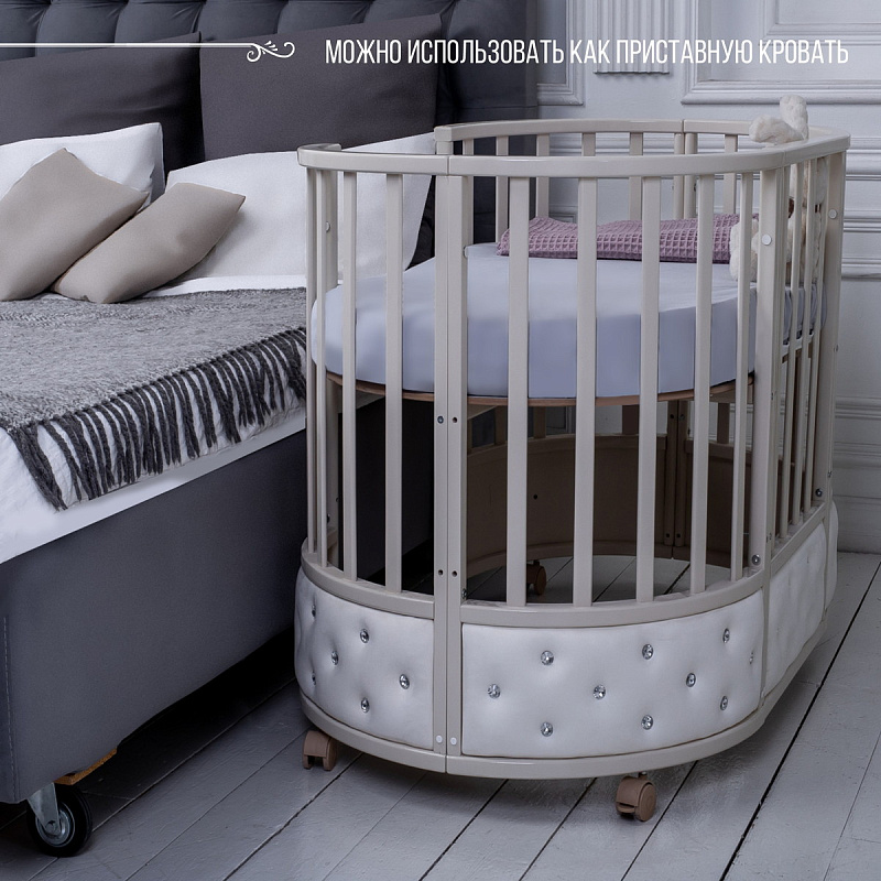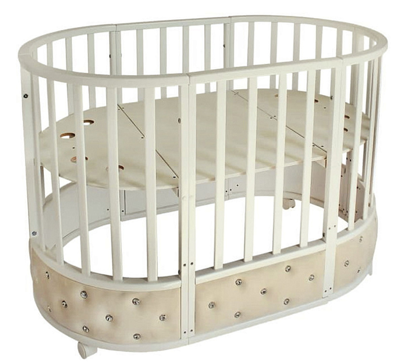 Новая кроватка Sweet Baby Cappellini 7 в 1 с мягкими вставками и стразами станет прекрасным украшением детской комнаты. Модель сочетает в себе роскошный дизайн, широкий набор функций и отличное качество. Модель адаптируется под растущего ребенка и имеет шесть вариантов трансформации: круглая кровать, овальная кровать, манеж, два стульчика, столик, диванчик. Кроватка Sweet Baby Cappellini можно укомплектовать универсальным маятником (артикул: 426811), что позволит собрать кровать с функцией как продольного так и поперечного качания. При необходимости маятниковый механизм фиксируется, либо полностью убирается. Колеса в данной модели можно использовать только без маятника. Маятник продается отдельно.