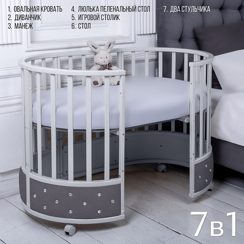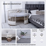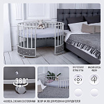 - адаптируется под растущего ребенка и имеет шесть вариантов трансформации: круглая кровать, овальная кровать, манеж, два стульчика, столик, диванчик