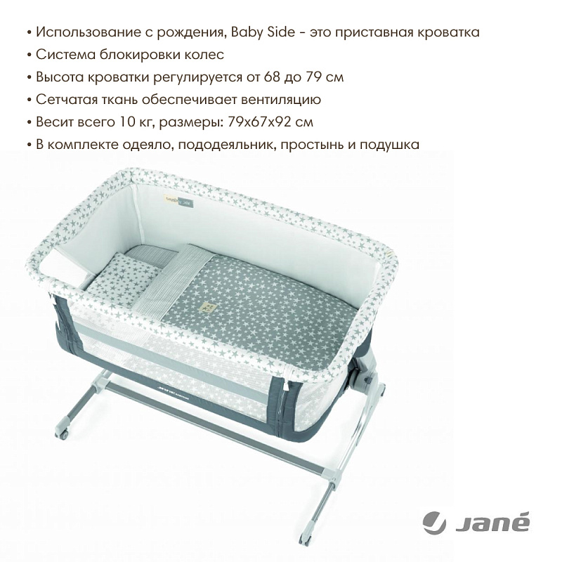 Кровать люлька Jane Baby Side приставная с комплектом постельного белья StarНет оценокХарактеристики