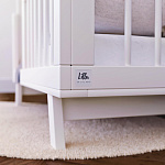 За безопасность ребенка отвечают натуральные материалы, более массивный и потому устойчивый каркас кроватки и стенки из надежных круглых реек, идеальных для захвата детскими ручками.