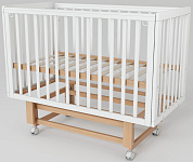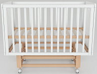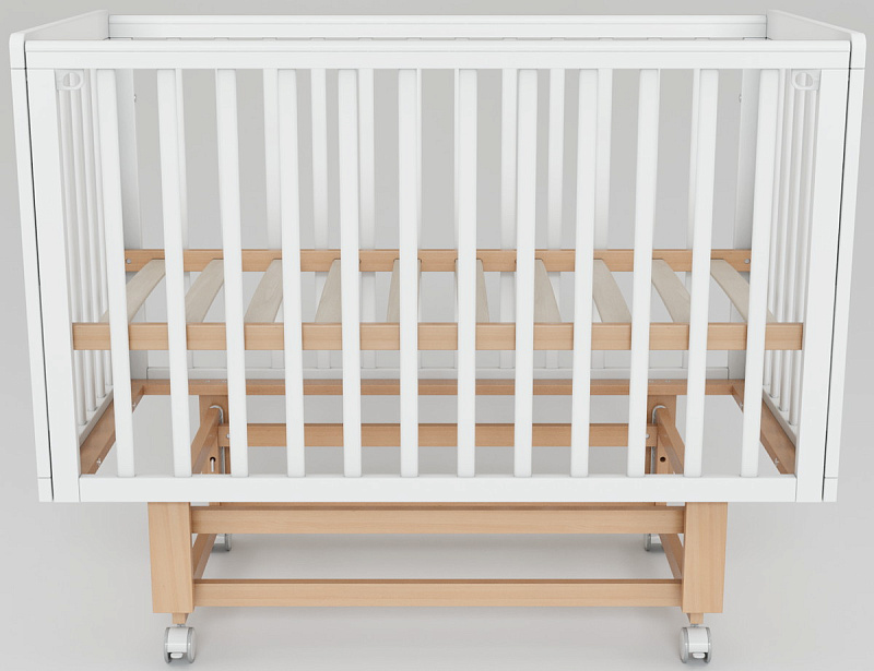 Основание кроватки представляет собой ортопедическую конструкцию из деревянных реек, обеспечивающую правильное развитие позвоночника ребенка и необходимую вентиляцию матраса. Четыре колеса, два из которых оснащены стопорами, позволяют легко перемещать кроватку по комнате и надежно фиксировать ее в выбранном месте.