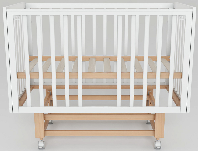 Основание кроватки представляет собой ортопедическую конструкцию из деревянных реек, обеспечивающую правильное развитие позвоночника ребенка и необходимую вентиляцию матраса. Четыре колеса, два из которых оснащены стопорами, позволяют легко перемещать кроватку по комнате и надежно фиксировать ее в выбранном месте.