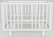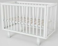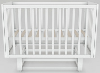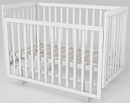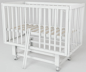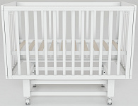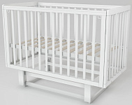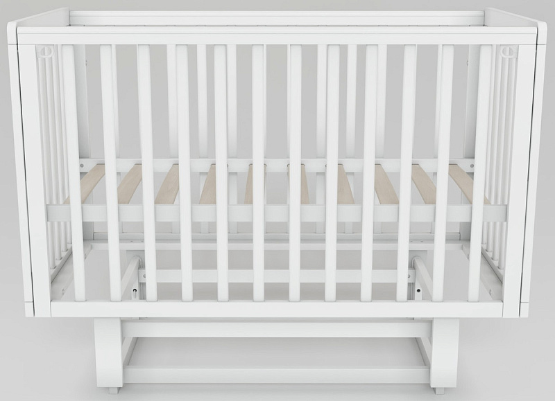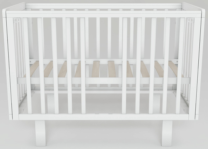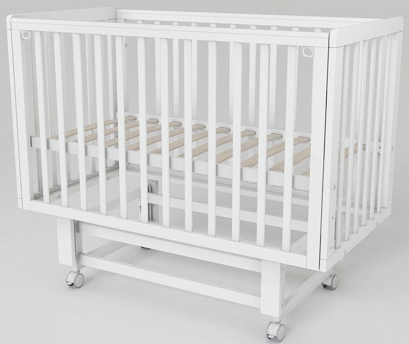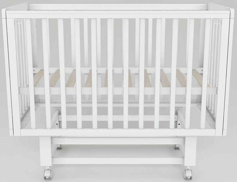 Основание кроватки представляет собой ортопедическую конструкцию из деревянных реек, обеспечивающую правильное развитие позвоночника ребенка и необходимую вентиляцию матраса. Четыре колеса, два из которых оснащены стопорами, позволяют легко перемещать кроватку по комнате и надежно фиксировать ее в выбранном месте.