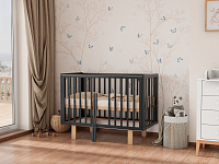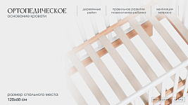 Основание кроватки представляет собой ортопедическую конструкцию из деревянных реек, обеспечивающую правильное развитие позвоночника ребенка и необходимую вентиляцию матраса. Четыре колеса, два из которых оснащены стопорами, позволяют легко перемещать кроватку по комнате и надежно фиксировать ее в выбранном месте.