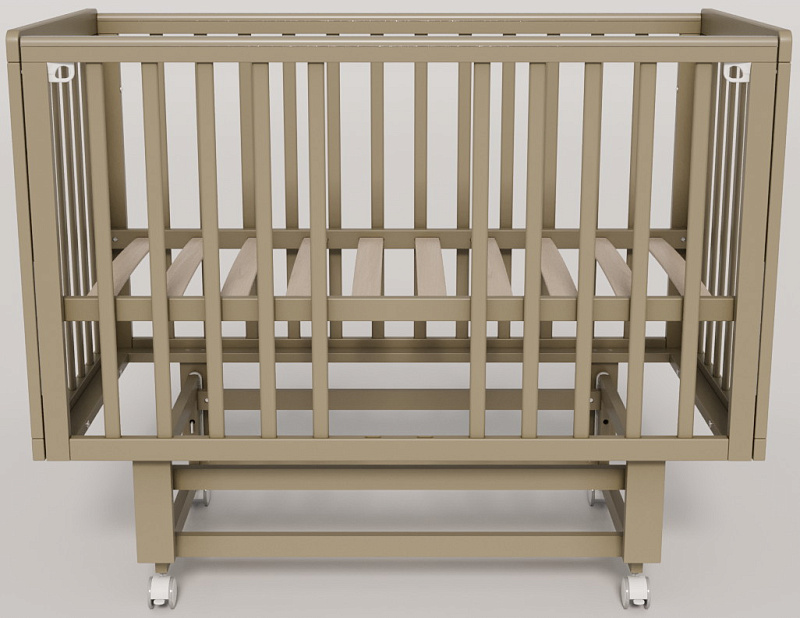 Основание кроватки представляет собой ортопедическую конструкцию из деревянных реек, обеспечивающую правильное развитие позвоночника ребенка и необходимую вентиляцию матраса. Четыре колеса, два из которых оснащены стопорами, позволяют легко перемещать кроватку по комнате и надежно фиксировать ее в выбранном месте.