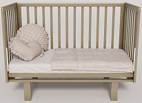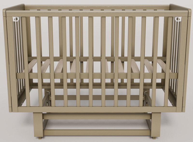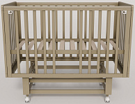 Основание кроватки представляет собой ортопедическую конструкцию из деревянных реек, обеспечивающую правильное развитие позвоночника ребенка и необходимую вентиляцию матраса. Четыре колеса, два из которых оснащены стопорами, позволяют легко перемещать кроватку по комнате и надежно фиксировать ее в выбранном месте.