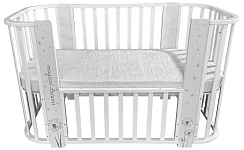 Кроватка имеет несколько возможностей трансформации: малая кровать (размер 100х70 см), большая (140х70 см), приставная (100х70 см), диван (140х70 см) и манеж.
