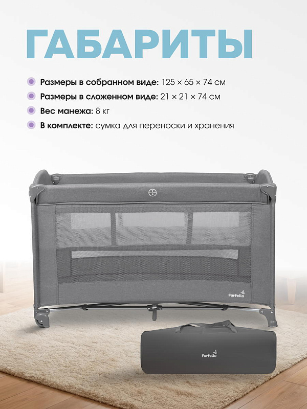 В комплекте — мягкий матрас, который обеспечивает комфортный сон, а также удобная сумка для хранения и транспортировки. Кроватка компактно складывается и легко помещается в сумку — её размер в сложенном виде позволяет хранить её в шкафу или багажнике.