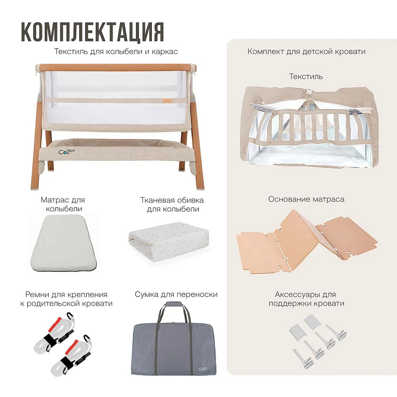 В режиме люльки CoZee XL представляет собой лёгкое и портативное решение, позволяющее вам держать ребёнка рядом в течение дня. Люлька идеально подходит для сна в разных частях дома: её можно плавно покачивать или фиксировать в неподвижном положении в зависимости от настроения малыша. Для этого нужно снять нижние ножки кроватки и установить отдельный комплект аксессуаров, включающий опорные ножки и поручни для качания. (Комплект аксессуаров для люльки продаётся отдельно).Колыбель: приставная или стационарная (аксессуары приобретаются отдельно)