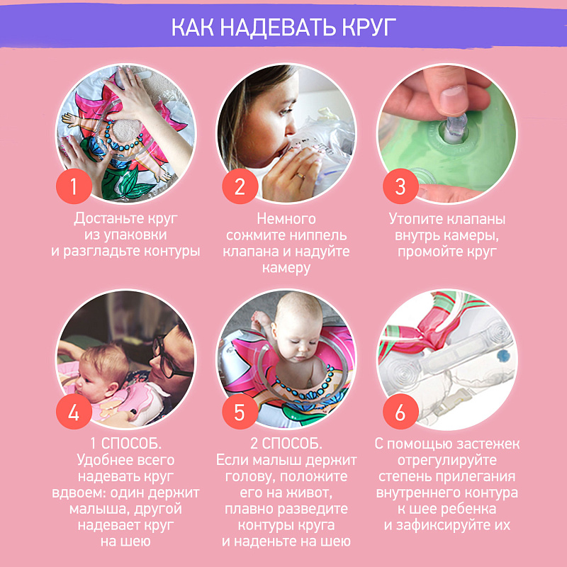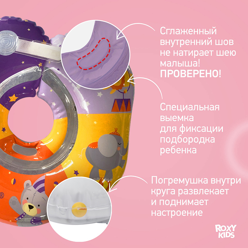 Круг на шею для новорожденных предназначен для купания с самого рождения. Его использование позволяет стимулировать инстинктивную способность детей плавать. Круг сделан из прочного полимера. Внутри камеры круга есть шарики-погремушки. Также у круга есть удобная выемка для подбородка малыша и ручки, благодаря которым родители смогут придерживать ребенка и задавать направление, в котором он плывет. Две удобные застежки (карабин и липучка) обеспечивают возможность быстрой и простой фиксации круга во время купания. Надувные круги обеспечивают наиболее удобное и правильное положение корпуса ребенка в воде. Для комфорта малыша круг имеет сглаженный внутренний шов. Соответствует европейским стандартам качества и безопасности детских товаров.