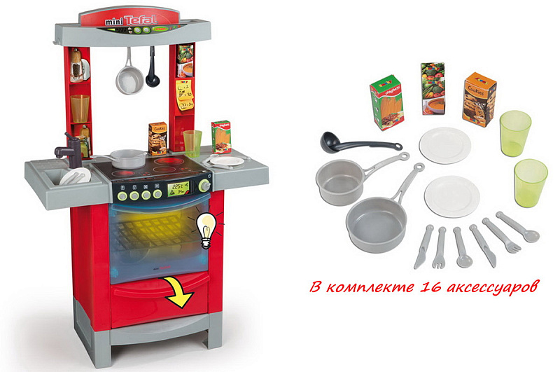 В наборесотейник, кастрюлька, половник, 2 тарелки, 2 стакана, 2 ложки, 2 вилки, 2 ножа, 3 коробочки с продуктами.