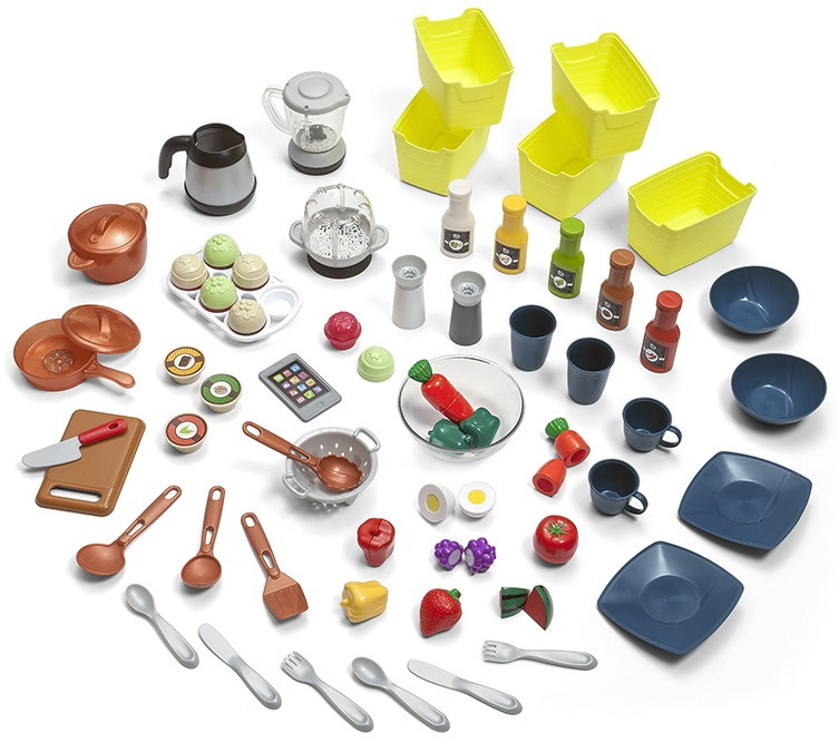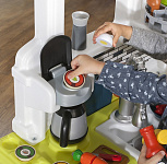 Современный дизайн и огромное количество замечательных функций заставит вас позавидовать детям! Стилизация стенок кухни «под плитку», широкая «гранитная» столешница, изящные «морозные узоры» на стеклах дверок и большая раковина со смесителем и кнопкой включения позволят малышам почувствовать себя на настоящей кухне. Множество встроенных шкафчиков, полочек, выдвижных ящиков и крючков помогут быстро рассортировать кухонные принадлежности по окончанию игры. Набор аксессуаров включает в себя посуду, столовые приборы, «продукты питания», кофейник с одноразовыми «капсулами», блендер, «медный» сервиз и кухонные принадлежности, в том числе и насадку для изготовления попкорна.