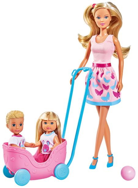 В наборекуклы Штеффи 29 см., Еви 12 см. и Тимми 12 см., коляска, щенок, котенок, аксессуары