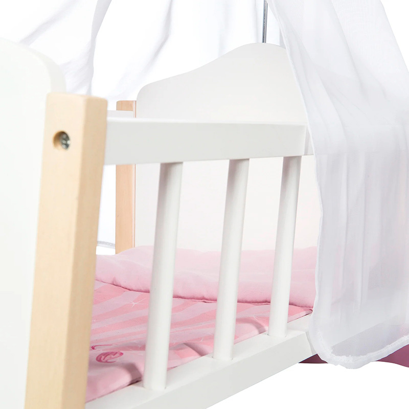 Кукольная колыбель Roba Scarlett окрашена в белый и розовый цвет, приглашает к веселым мечтам и играм с куклой. Детская кукольная люлька оснащена постельным бельем (1 подушка, 1 одеяло) и красивым пологом с подвесной звездой. Набивная звезда спереди и симпатичная печать на текстиле придают этому лакированному кукольному аксессуару нежный характер.