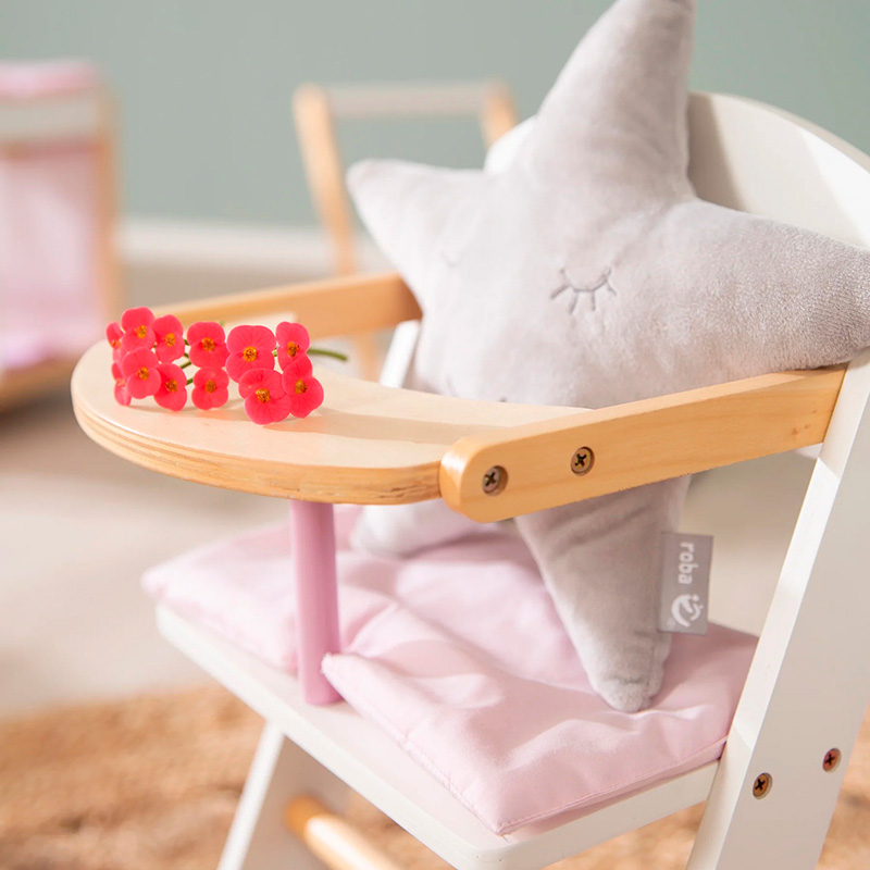 Со стульчиком для кормления Roba Scarlett куклы и пупсы могут сидеть за столом с кукольными мамой и папой. Кукольная мебель поставляется в разобранном виде. Сборка очень проста. Все используемые материалы проверены на наличие вредных веществ и сертифицированы. Кроме того, они регулярно проверяются во время производства.