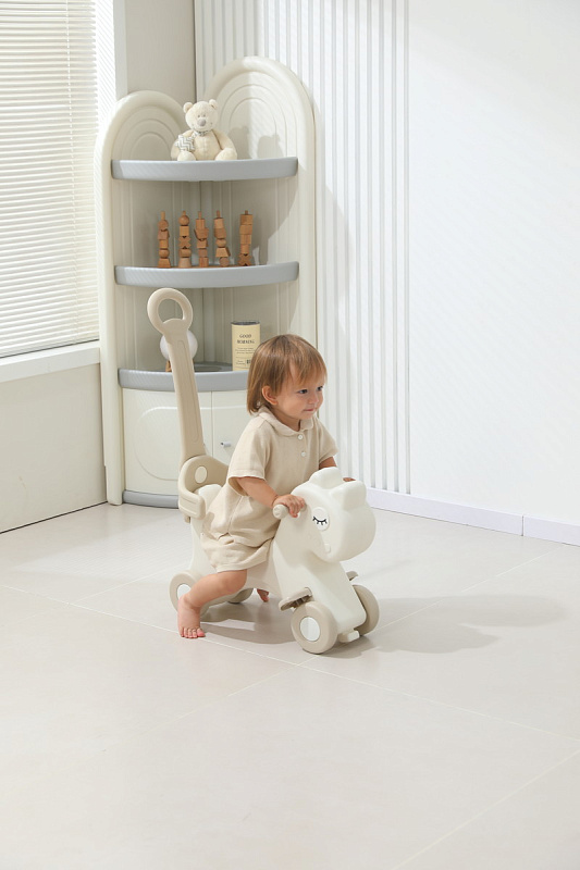 Объединяет сразу четыре вида развлечений для малышей: удобный балансборд, качалку, каталку и беговел.