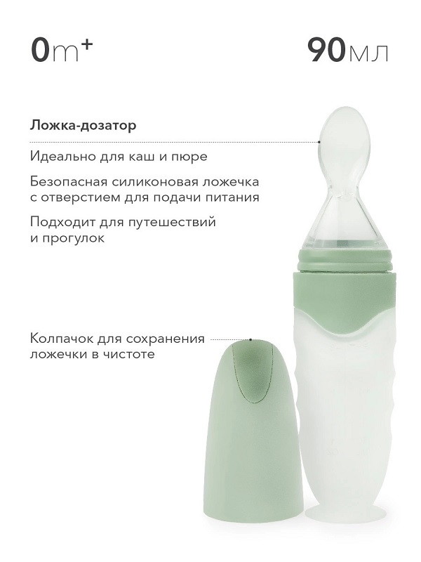 Ложка-дозатор позволяет быстро и без труда накормить ребёнка в любом месте. Дозатор, заполненный пюре или кашей, можно убрать в сумку и взять с собой куда угодно. Когда малыш проголодается, достаточно добавить жидкость в контейнер, затем взболтать содержимое и можно приступать к еде. Питание течёт через специальное отверстие и попадает сразу в ложку, что позволяет кормить ребёнка одной рукой.